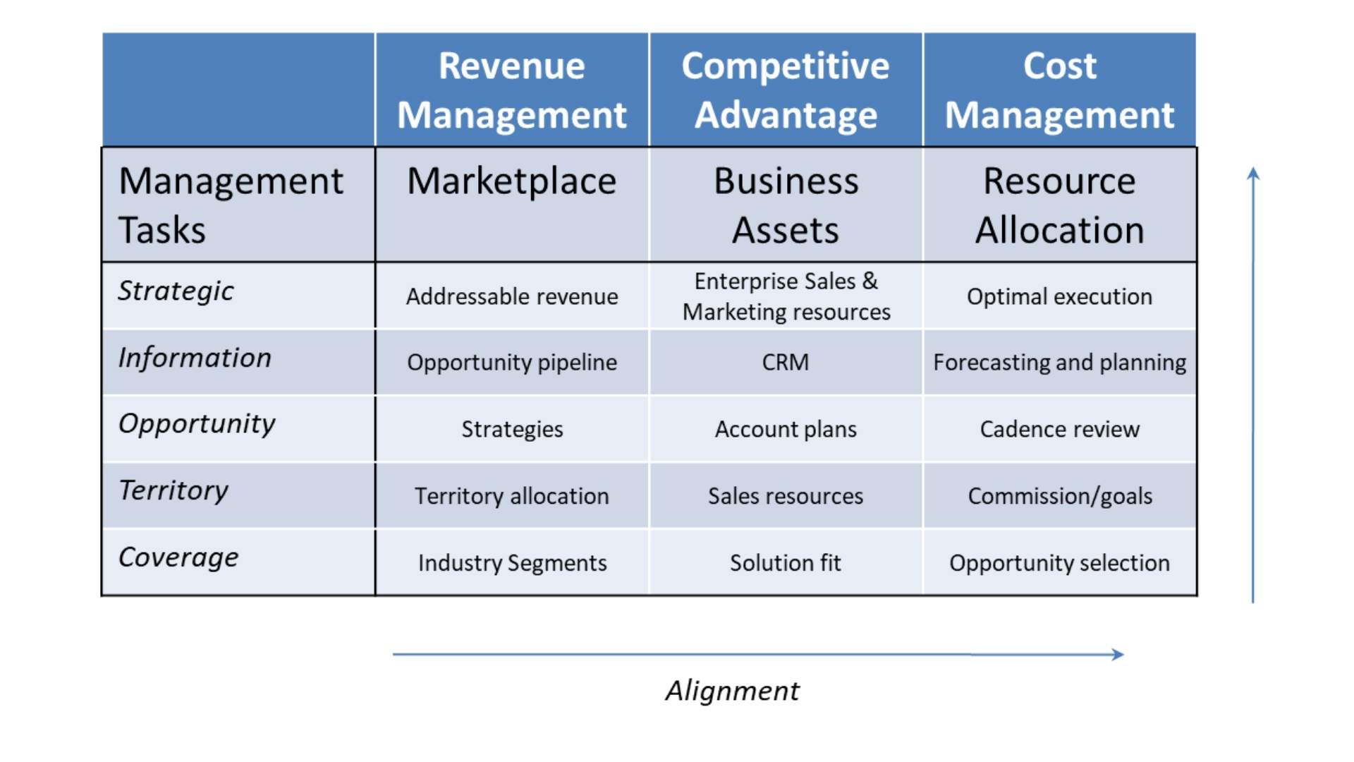 The attached figure describes the key elements of industrial sales function. On the top line you have a description of what a sales function is supposed to do: Understand where the revenue opportunities are (revenue management), generate the ability to effectively compete for those revenues (competitive advantage), and manage the cost of selling into the markets you wish to serve (cost management).